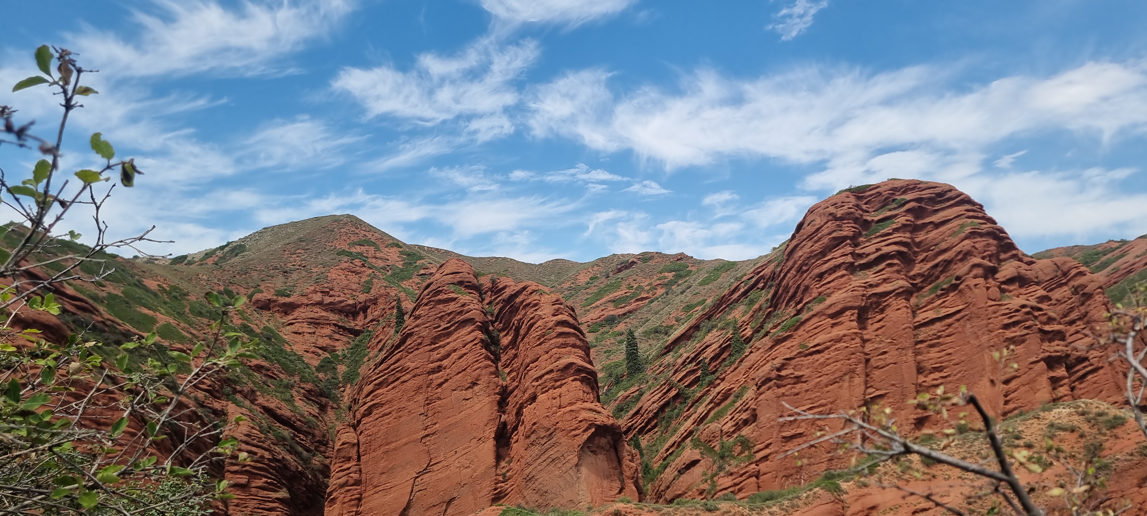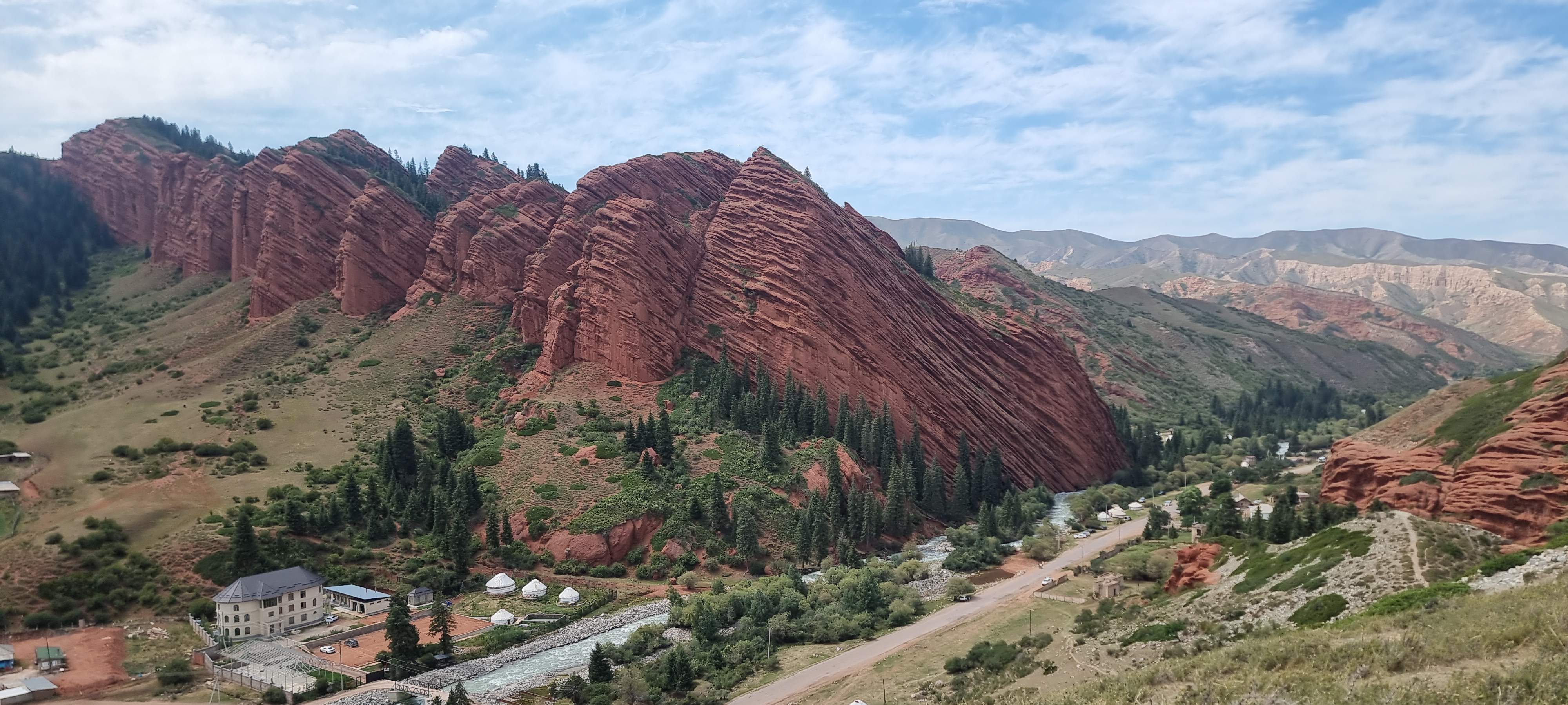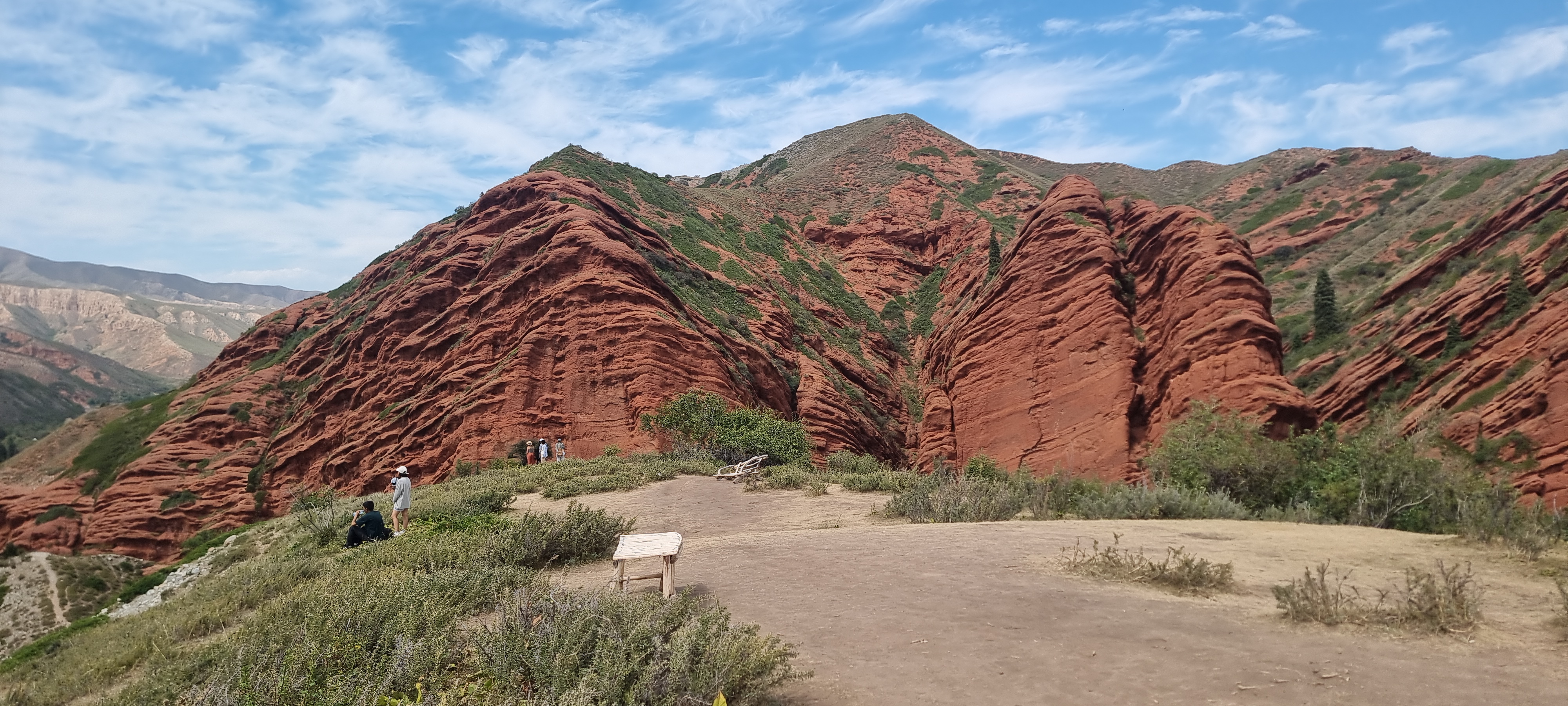 붉은색 사암이 절경을 이루고 그 아래에서는 키르키즈의 전통을 체험할 수 있다. 우리도 키르키즈 전통 수차이(우유차)와 말젖으로 만든 술을 맛보고 독특한 복숭아도 먹어본다. 전통빵도 맛보고.
