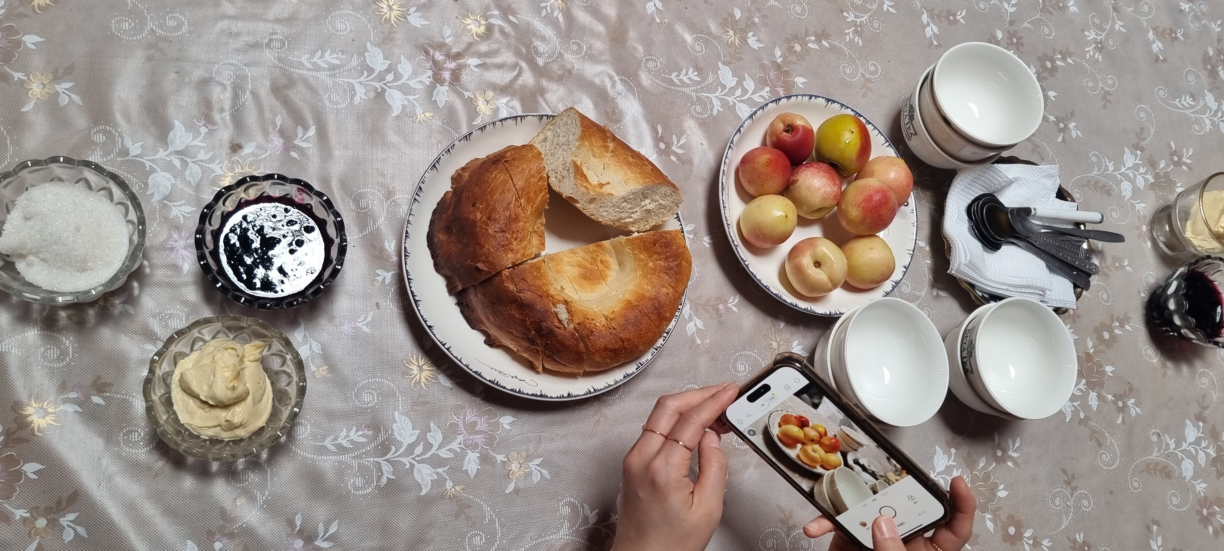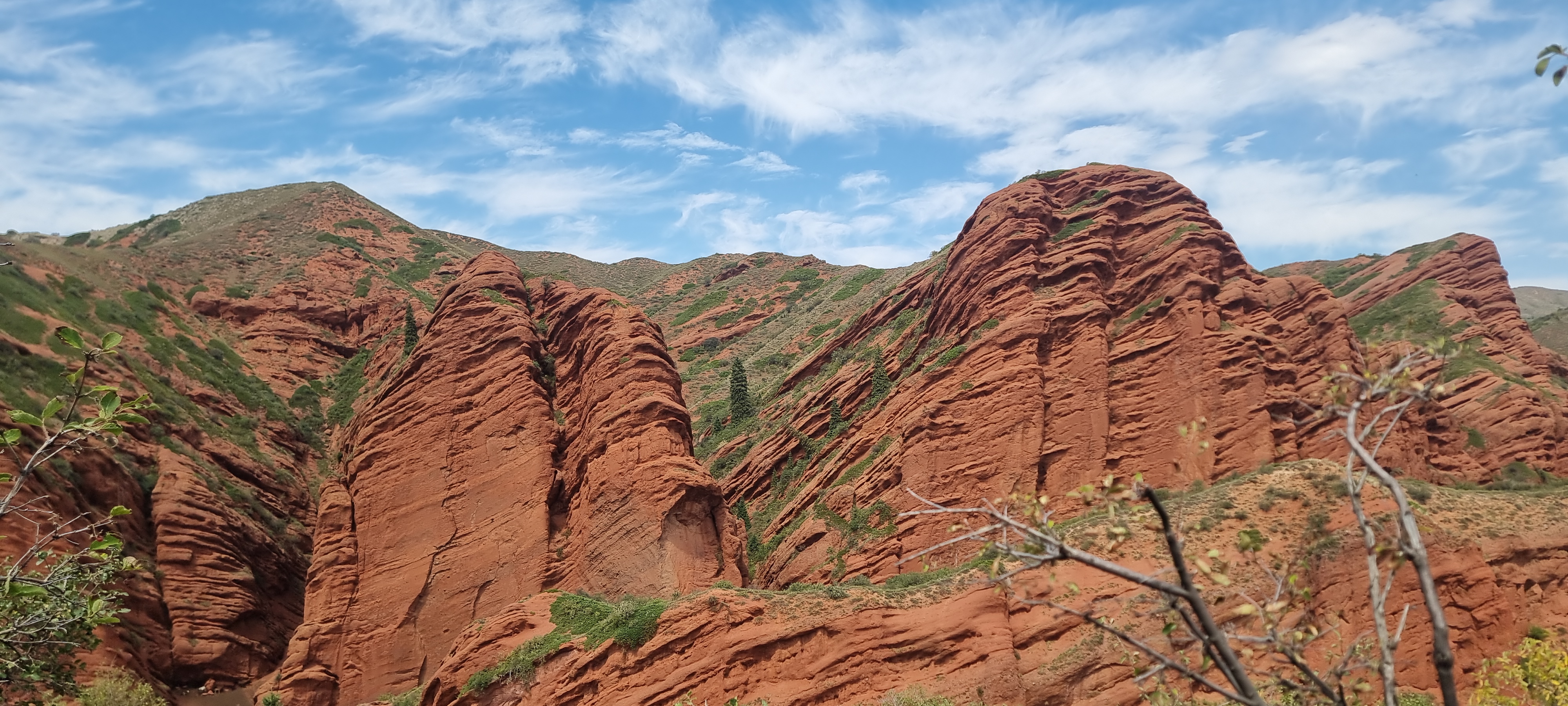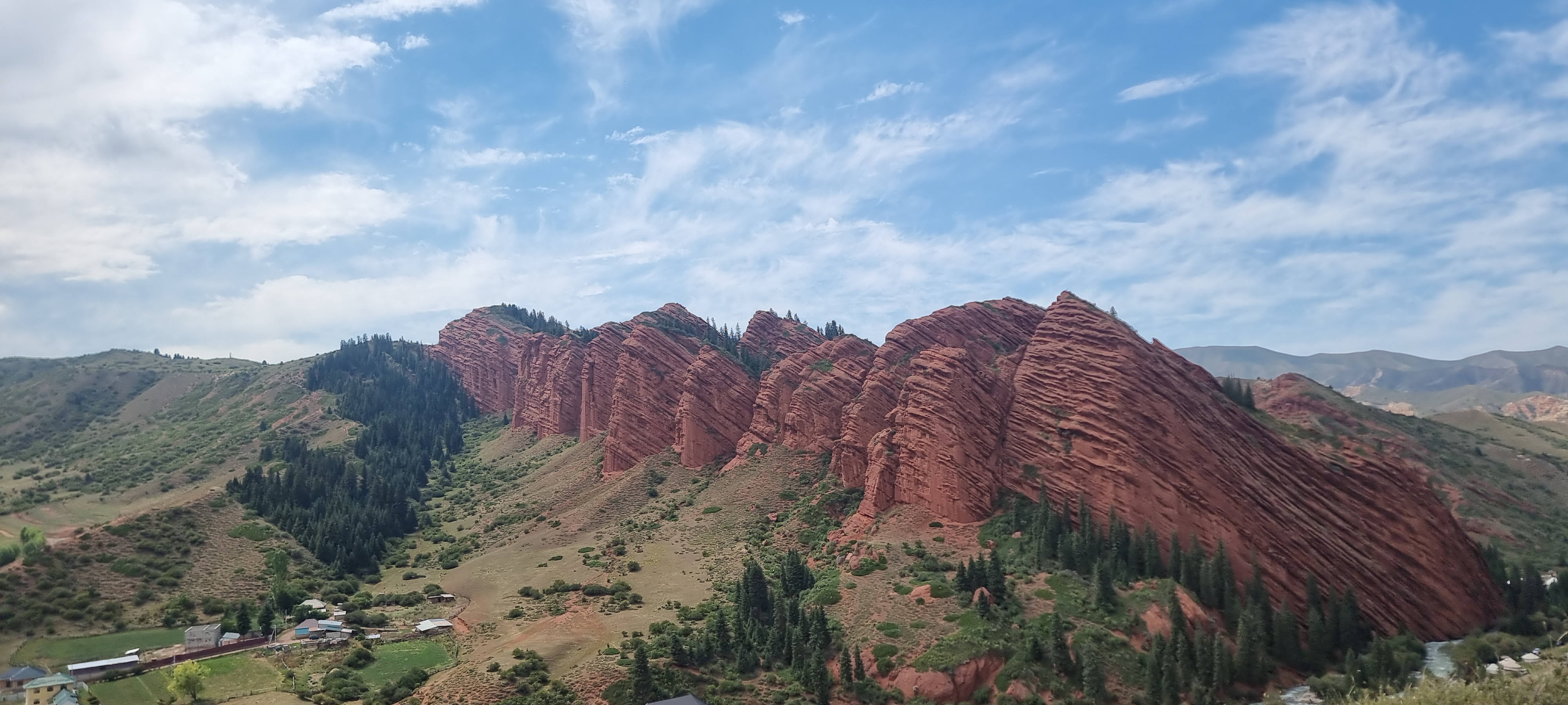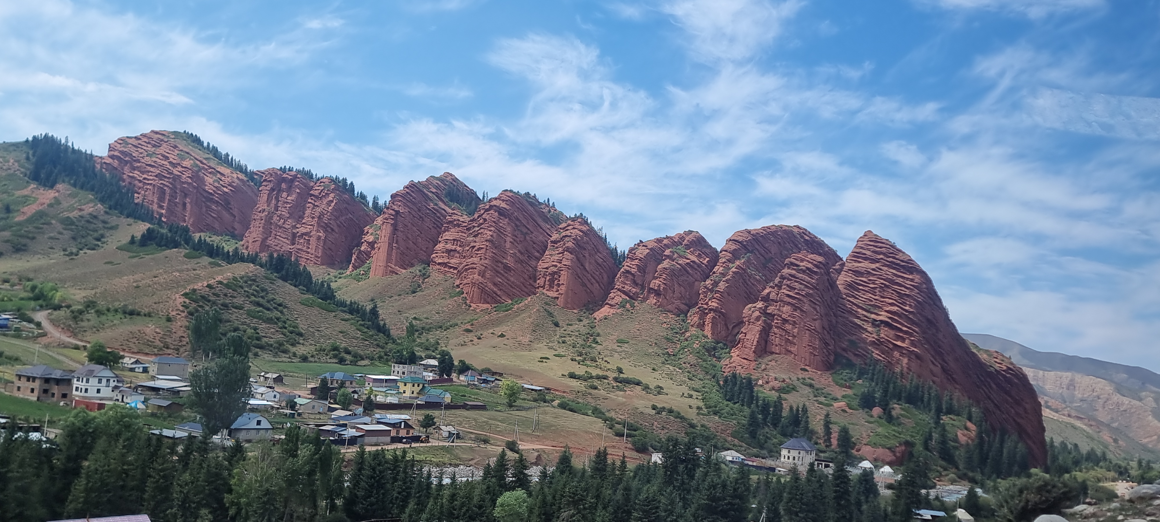 붉은색 사암이 절경을 이루고 그 아래에서는 키르키즈의 전통을 체험할 수 있다. 우리도 키르키즈 전통 수차이(우유차)와 말젖으로 만든 술을 맛보고 독특한 복숭아도 먹어본다. 전통빵도 맛보고.