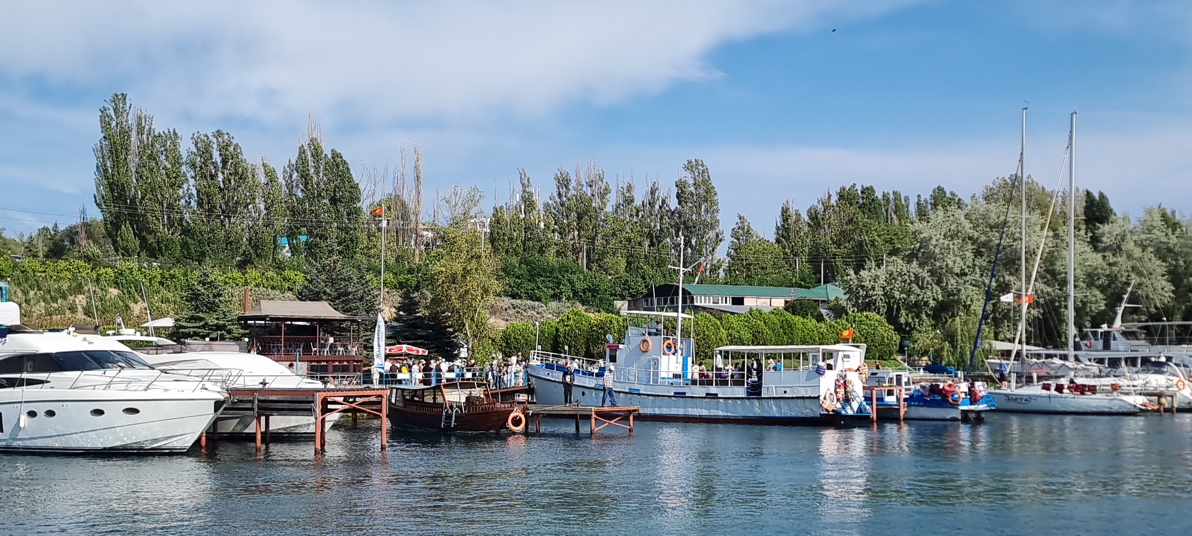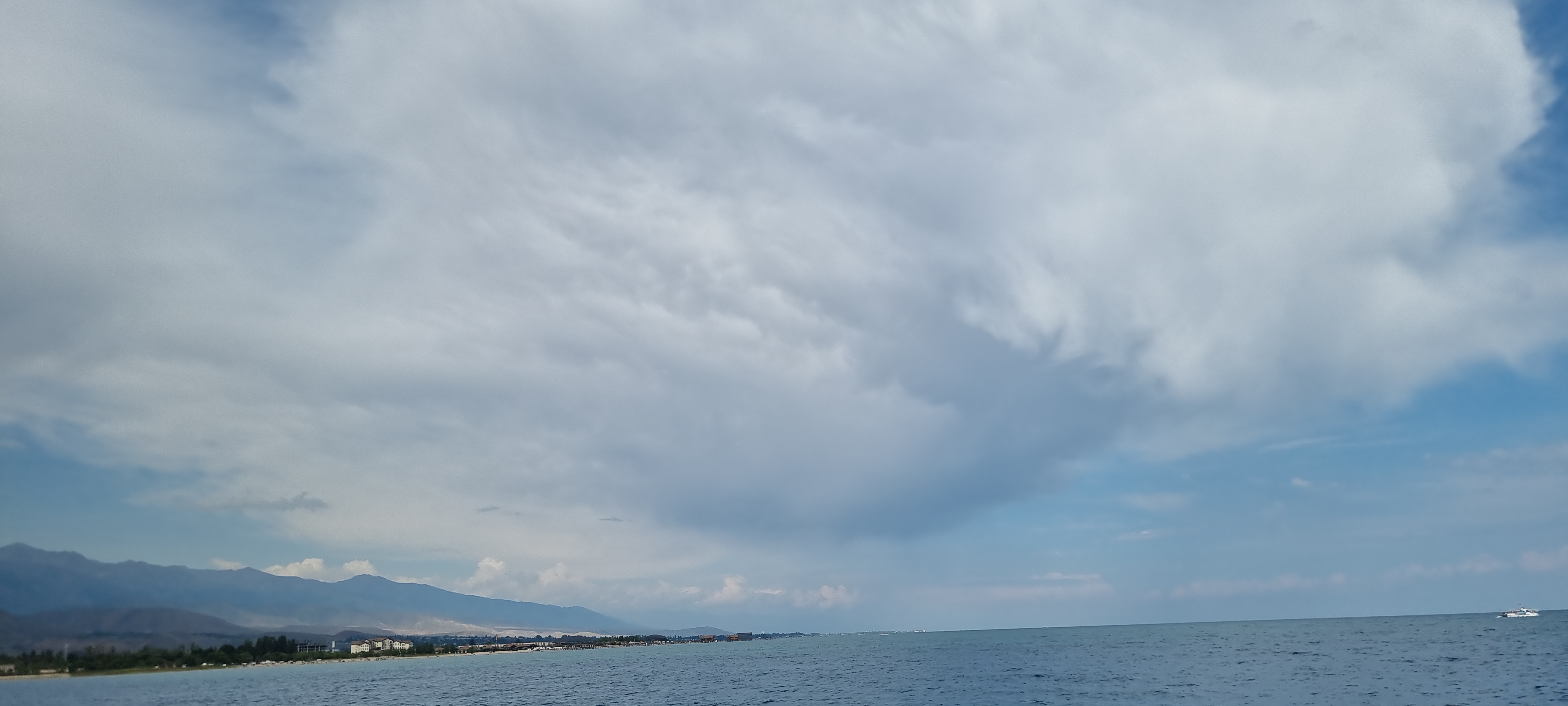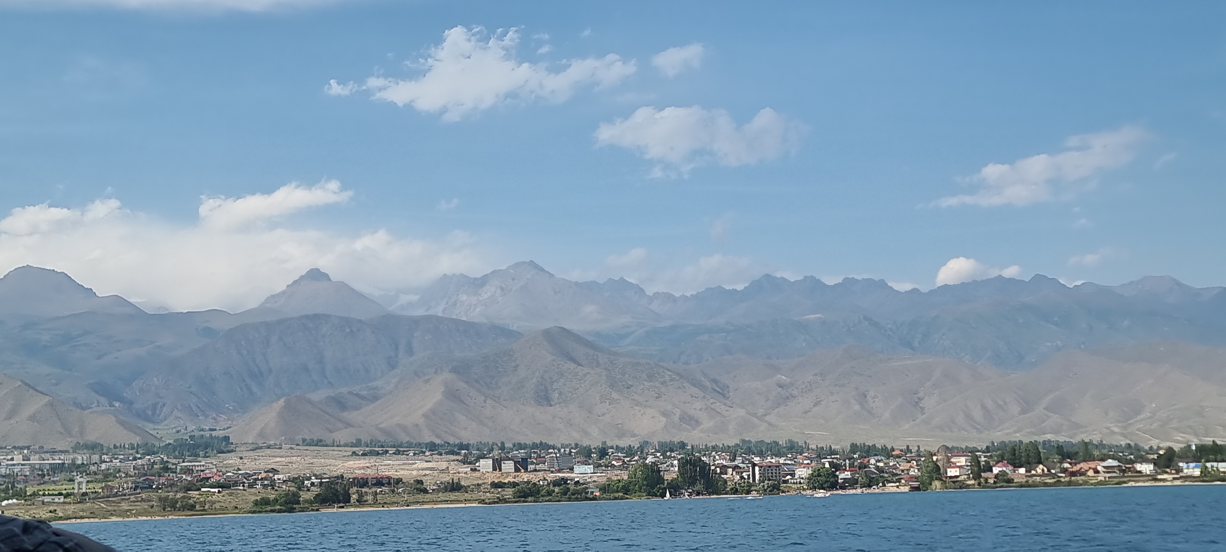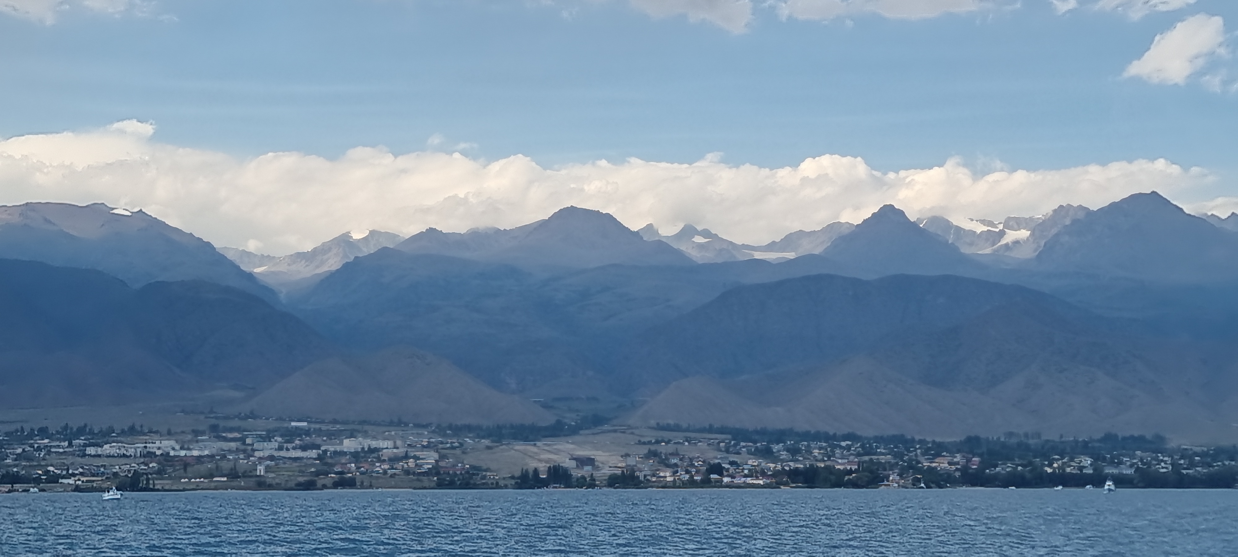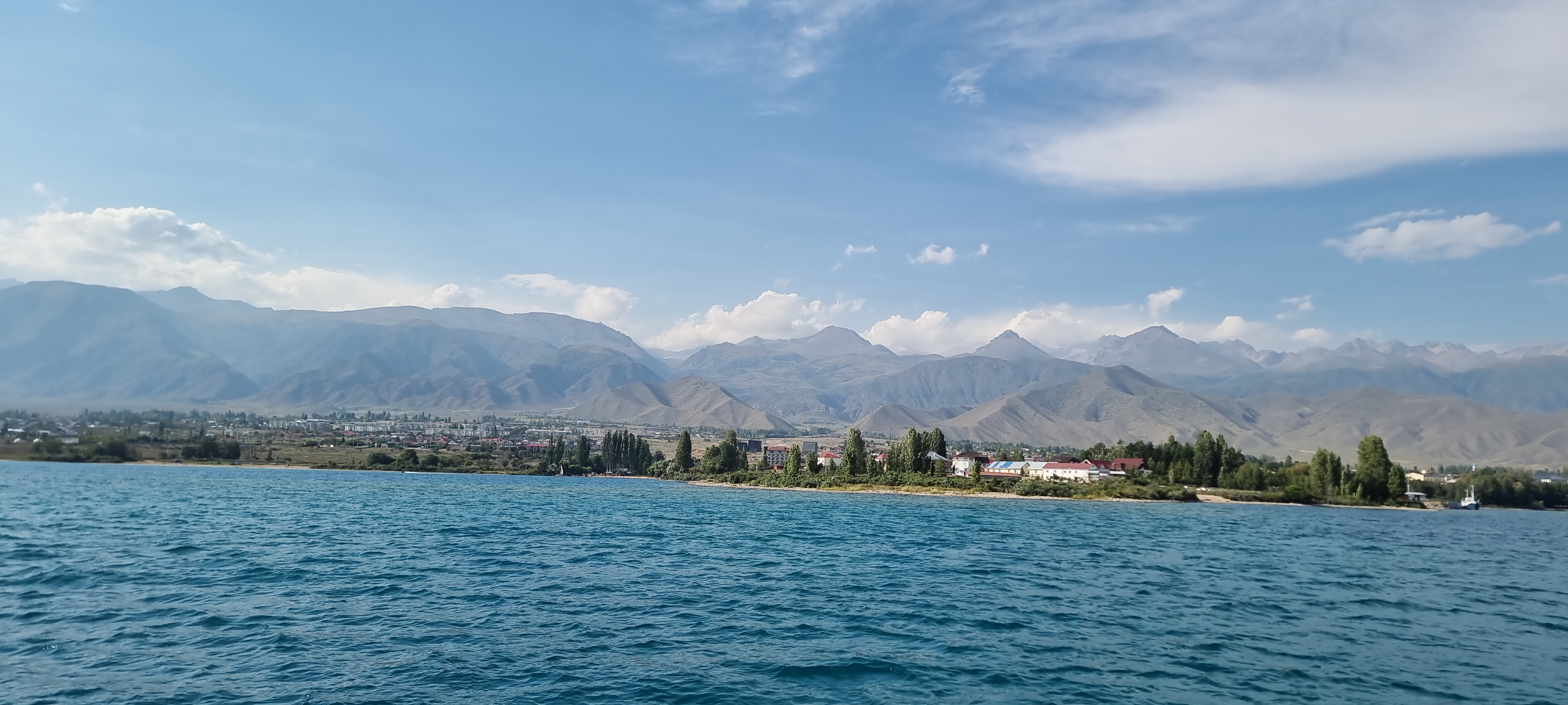 유람선 선상 투어. 이식쿨 호수는 세계에서 두번째로 큰 산정호수라고 한다. 둘레 약 400KM, 최대깊이 600M, 해발고도 1600M, 제주도 면적의 3.5배 정도 된다고 한다. 염도가 있는데 가이드들이 말하는 염도는 3%에서 16%까지 된다고 하는데 호수물을 맛을 보니 그리 짜갑지 않는 것으로 보아 %를 퍼밀로 바꾸든지 아니면 숫자 앞에 점을 하나 찍으면 될 것 같다는 생각이 든다. 0.3%~1.6%라면 밀이 될 것 같다.