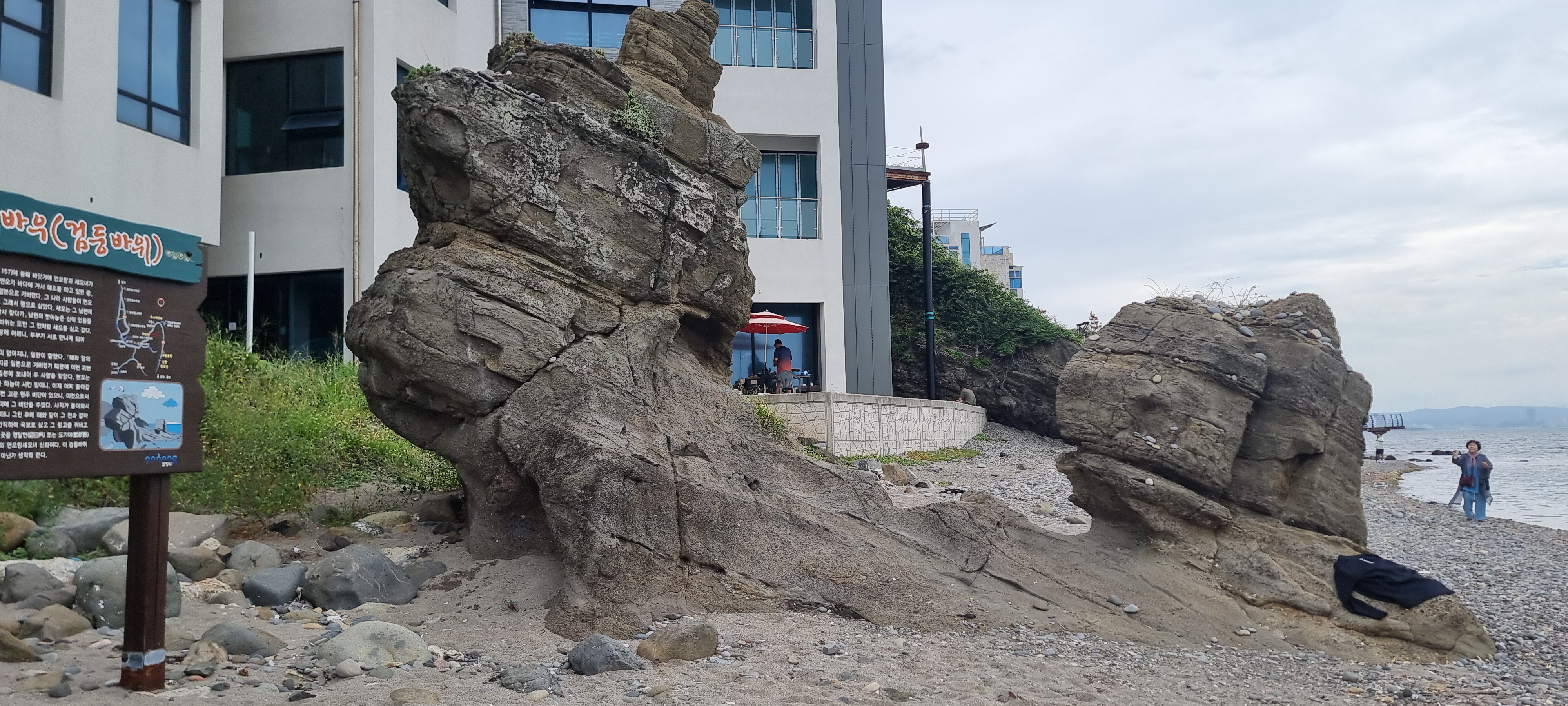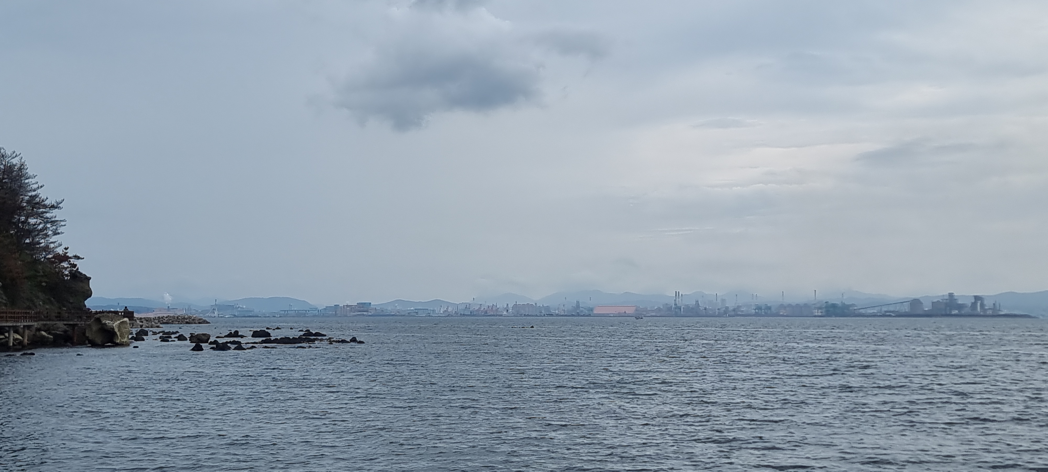 저 멀리 보이는 것은 수평선이 아니다. 포항제철과 포항시내가 보인다. 꼬리끝(!)에서 보는 포항이다.